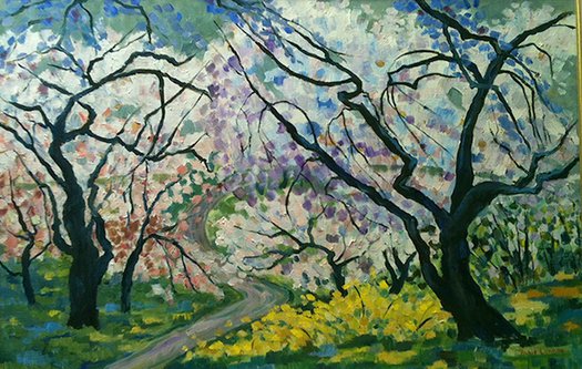 Cherry Blossom Time, # 406, by Annie Lenney, Oil painting, 24 x 36 inches, c.1974, Potsdam Public Museum