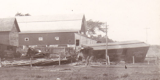 On August 22, 1889, a Barnum and Bailey Circus train on its way to Montreal crashed two and a half miles north of Potsdam. As the train ran downhill into Clark's Crossing, an axle broke in a car near the engine of the train, leading to a six-car pile-up. The attendants struggled to free their panicking animals from the wreckage. Remarkably, none of the passengers or the elephants died, but two camels, a trick mule, and twenty-eight horses perished. The surviving animals were housed at a local farm, and the villagers flocked to see them. It was calculated that the wreck cost Barnum and Bailey $58,000.1896 Dynamite Wreck